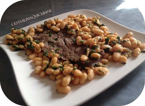 Ma chere Salima du joli blog C’est Salima qui cuisine et dont je suis fan depuis maintenant 4 ans a teste le steak a l’ail et haricot blancs