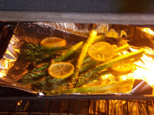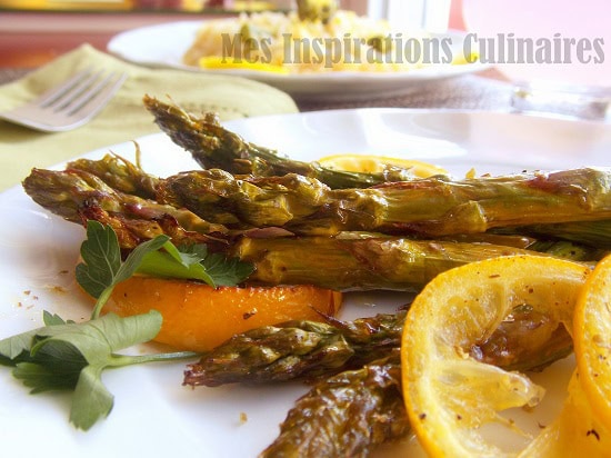 Des asperges et des rondelles de citron rôties, le tout saupoudré d’herbes. Une recette très simple que j’avais préparé en même temps que mon risotto aux asperges.