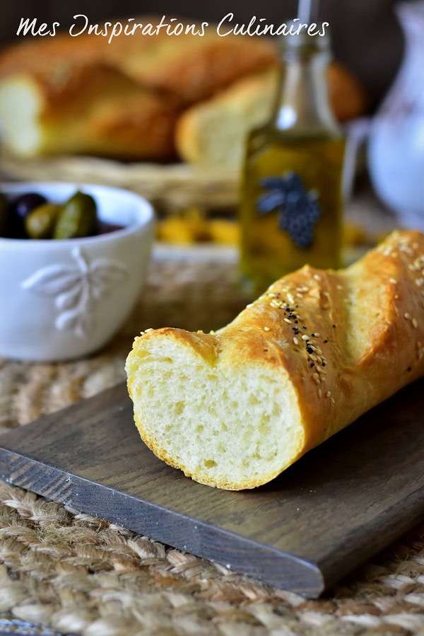 Ce pain se prépare à la MAP et à la main aussi comme pour ma recette qui suit il est agréablement parfumé à l’huile d’olive et on badigeonne les baguettes de blancs d’oeuf avant de les enfourner.