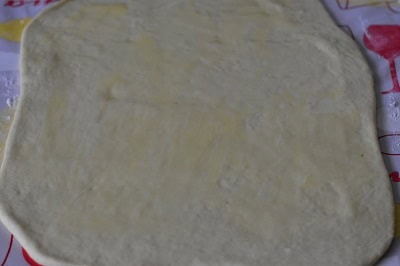 - On étale à l'aide d'un rouleau à pâtisserie en un rectangle. On badigeonne une seconde fois de beurre fondu.