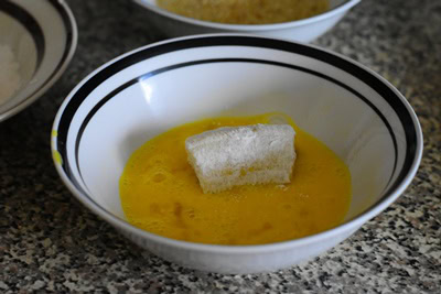 - Rouler chaque morceau dans la farine, ensuite dans l'oeuf battu et enfin dans la chapelure.