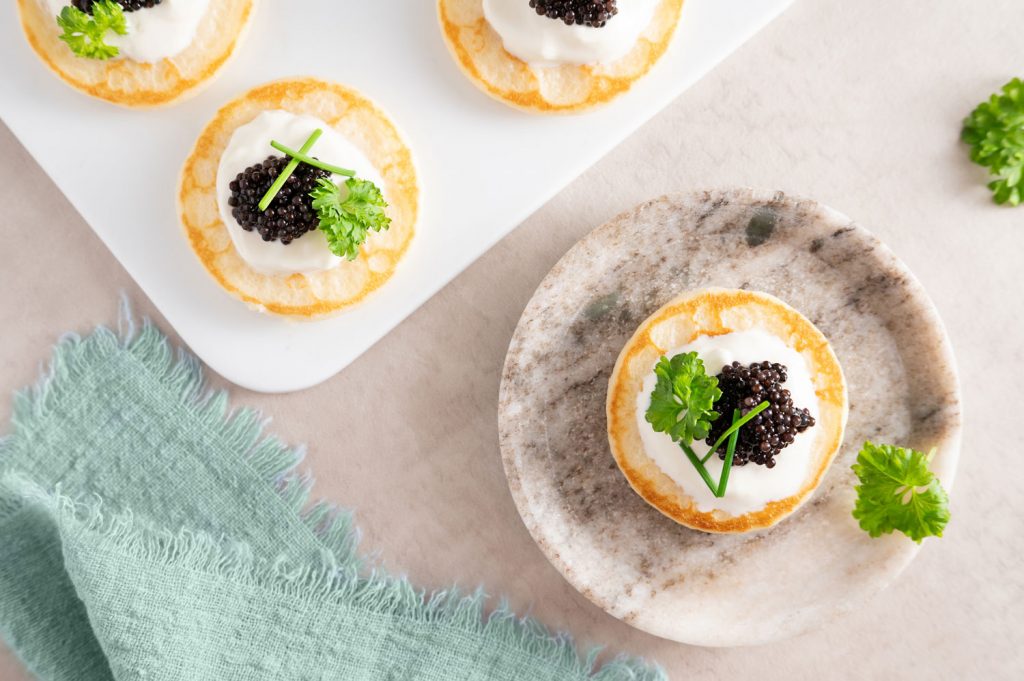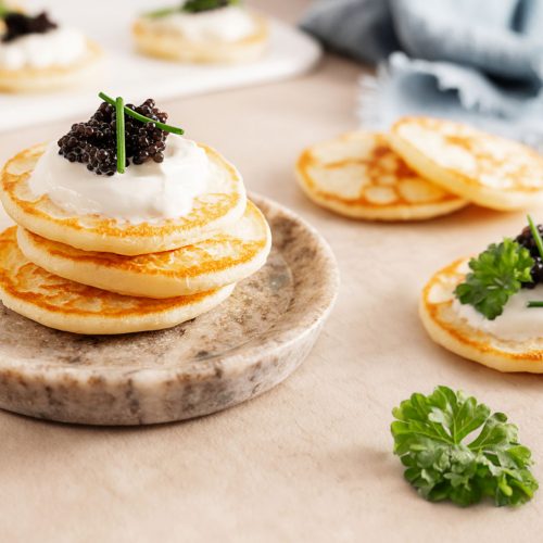 Les blinis de pommes de terre maison, crème fraîche et caviar allient simplicité et raffinement.