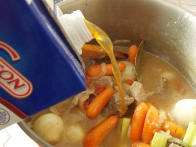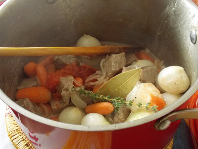 - Ajouter le bouquet garni la tomate écrasée ainsi que le bouillon de boeuf. couvrir et laisser cuire à feu doux durant 1 heure.
