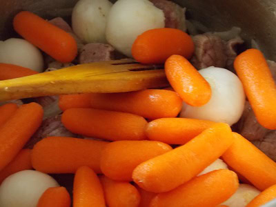Dans ma recette j’ai rajouté des champignons (les crimini) ainsi que de petits oignons mais on peut tout aussi bien se limiter à la recette classique du boeuf carottes.