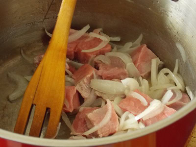 - Faire fondre de beurre dans une marmite. Ajouter la viande et faire revenir quelques minutes.