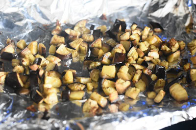 - Déposer les aubergines sur une plaque recouverte de papier sulfurisé, saler et arroser d'huile d'olive. Mélanger bien le tout et rôtir environ 20 à 25 minutes dans le four préchauffé à 200 C. Verser dans un saladier.