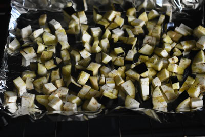 L’aubergine est coupée en dés et rôtie au four quelques minutes arrosée d’un filet d’huile d’olive je trouve que cela donne une belle saveur à ces kefta d’aubergines vous pouvez choisir de les faire revenir quelques minutes à la poêle.