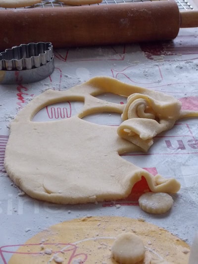 Sur une surface légèrement farinée, étaler la pâte au rouleau à pâtisserie et découper des losange à l’aide d’emporte-pièce.