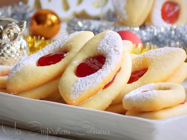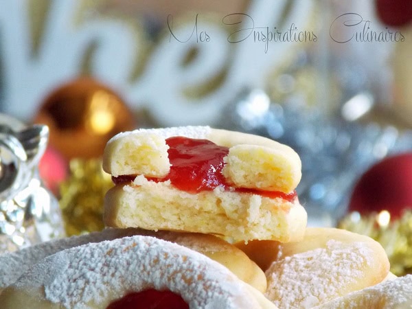 De délicieux biscuits de Noël Alsaciens des Bredele fondants fourrés à la confiture de fraise accompagnés d’un bon chocolat chaud a la cannelle un pure bonheur. La forme traditionnelle de ces biscuits Bredele Spitzbuben est en losange, j’ai essaye de me rapprocher le plus.