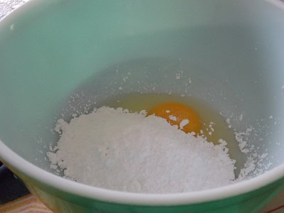 - Dans un grand bol fouetter ensemble le sucre glace, l'oeuf et les grains de vanille.
