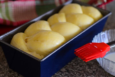 - Façonner des boules de poids égale et déposer dans un moule à cake ou à pain de mie préalablement beurré, ou façonner 3 boules et les étaler finement en un long boudin et façonner une tresse, placer dans le moule à cake.