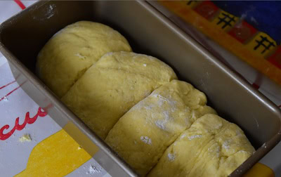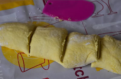 - Retirer la pâte du réfrigérateur, fariner le plan de travail et façonner votre pâte j'ai rouler la pâte en un long boudin et j'ai découpé 4 pâtons, forme des boules et place dans un moule a cake. Couvrir et laisser lever 2heures.