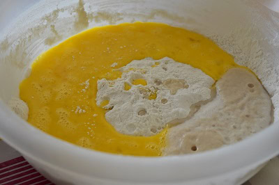 - Battre les oeufs et ajouter la levure boulangère (Si vous utilisez la levure sèche active la dissoudre dans un peu d'eau tiède et laisser mousser 15 minutes et l'ajouter aux oeufs).