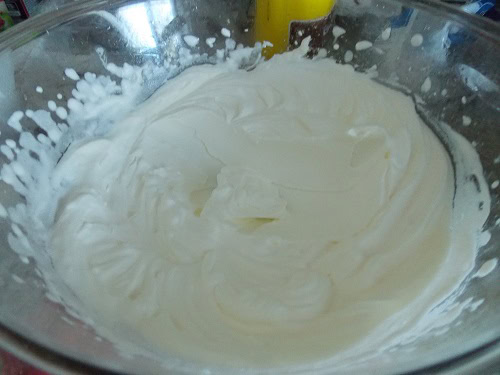 - Faire bouillir le sucre et l'eau dans une casserole jusqu’à atteindre 118 C (il est préférable d'utiliser un thermomètre), et battre les blancs d'oeuf en même temps vitesse maximale. Quand les blancs sont montes et le sirop a atteint la température souhaitée, réduire la vitesse du batteur et verser le sirop lentement tout en continuant a battre.