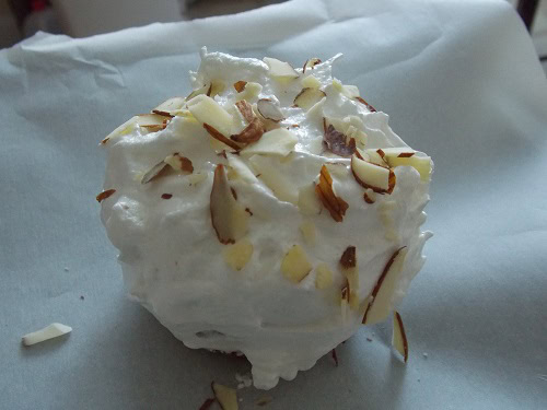 - Couvrir de meringue italienne. Saupoudrer d'amandes effilées. Placer sur la plaque recouverte de papier sulfurisé.