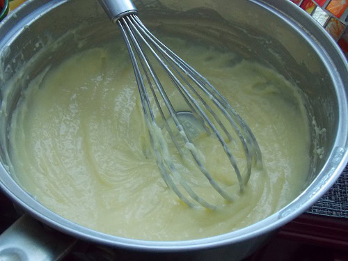 - Verser le tout dans la casserole et remuer sans cesse jusqu’à ce que la crème épaississe.