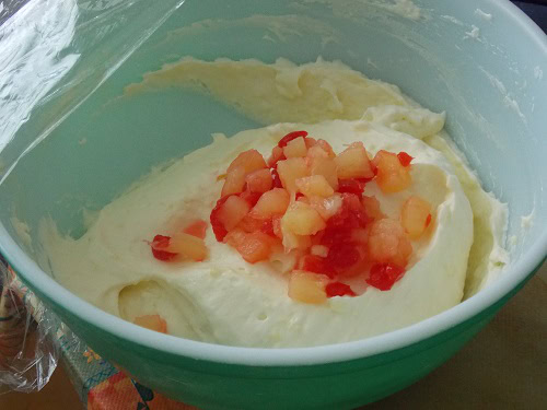 Je n’ai pas trouvé de fruits confits et mes filles n’aiment pas trop ça, j’ai donc pris des ananas et des cerises que j’ai découpé en petits morceaux.