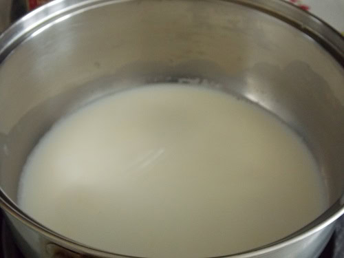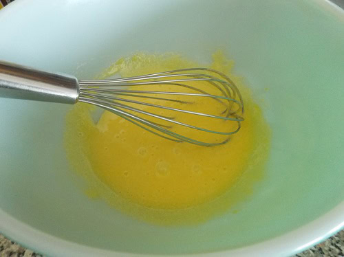 - Verser la moitie du lait sur le mélange oeuf et sucre tout en fouettant.
