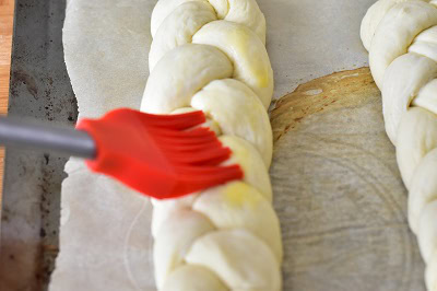 - Badigeonner les brioches tressées d'oeuf battu et les placer au réfrigérateur pour 10 minutes.
