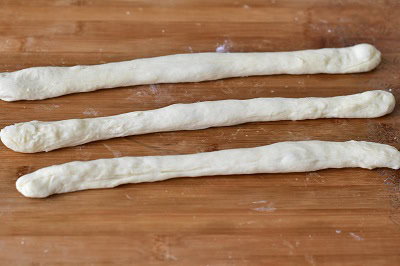 Farinez le plan de travail, prendre 3 petites boules et les rouler finement sur elles-mêmes.
