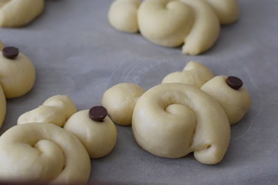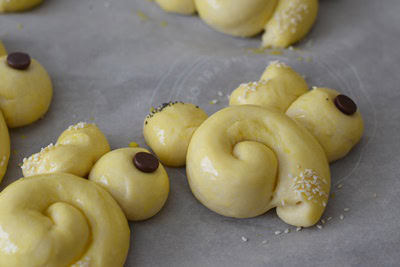 - Parsemer si désirée de graine de sésames. Disposer une pépite de chocolat sur la tête de chaque lapin en brioche.