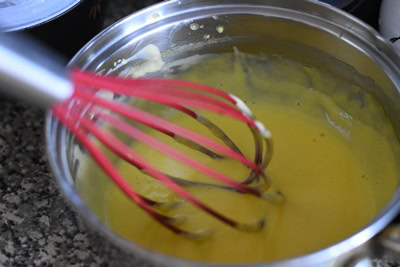 - Fouetter les jaunes d'oeufs dans un saladier et ajouter le mélange de lait-crème tout en fouettant.