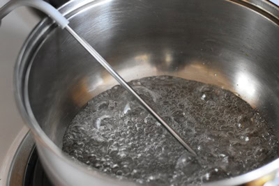 - Préparer la meringue italienne en portant à ébullition l'eau et le sucre dans une casserole jusqu’à ce que la température atteigne 121 C.