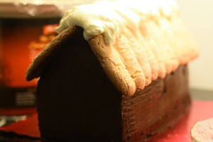 Pour coller les biscuits sur le chalet je me suis servi de la ganache au chocolat refroidit et épaissit.