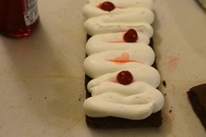 - Déposer une première bande de génoise sur une surface plate. Imbiber de sirop de cerise dilue d'un peu d'eau.