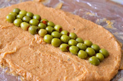 - Déposer les olives vertes tout le temps (si vous préférez couper en rondelles les olives et les ajouter à la pâte avant de la verser sur le film plastique je trouve que c'est plus pratique).