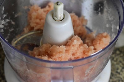 - Commencer par couper les escalopes en petits morceaux et les ajouter au mixer ou robot culinaire.