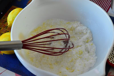 - Dans un saladier mélanger le sucre et le zeste de citron et sabler entre les doigts jusqu’à humidifier le sucre.