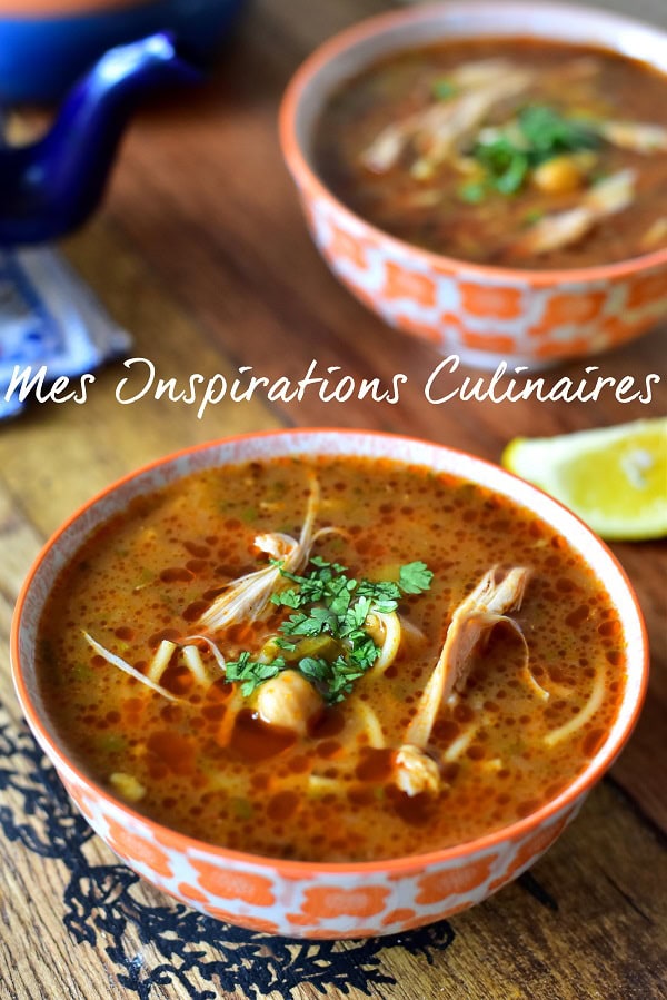 Cette recette de chorba au poulet est une Chorba hamra (soupe au poulet sauce rouge), c’est la préférée de ma petite Lylou car elle ne mange pas de viande rouge. Je la parfume à la menthe et d’un soupçon de cannelle. En fin de cuisson je jette une poignée de vermicelle (cheveux d’ange) dans la soupe.