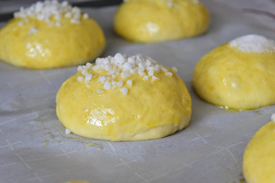 Préchauffez le four à 250 C (j’ai diminué à 200 C). Parsemez de sucre perlé, puis enfourner durant 15 minutes environ ou jusqu’à ce que les brioches aient une belle couleur dorée.