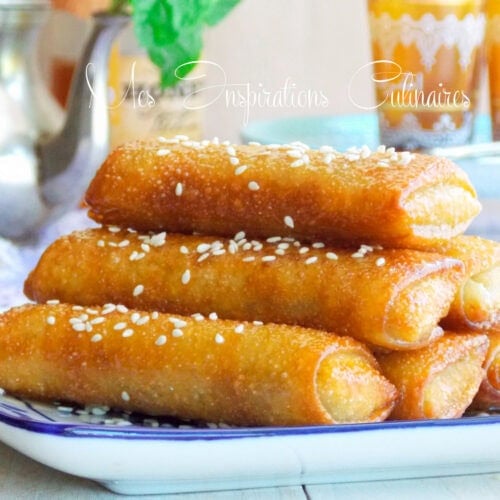 Égoutter les cigares et les plonger dans le miel chaud. Disposer ensuite sur une assiette de service et saupoudrer de sésames ou cacahouètes concasses.