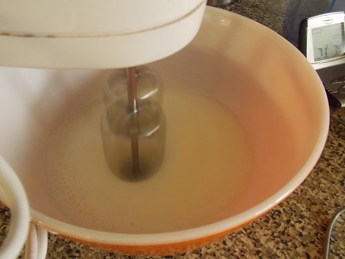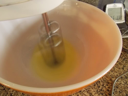 - Verser le sirop en filet sur les blanc d'oeuf et réduire la vitesse du batteur tout en continuant a battre.