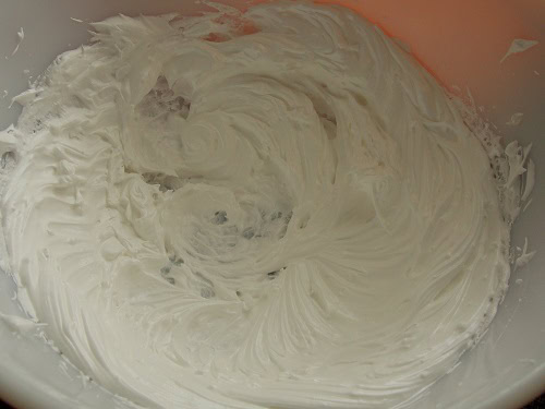 Après avoir verser le sirop augmenter la vitesse du batteur et continuer à battre jusqu’à refroidissement total de la meringue. Vous remarquerez que la meringue devient plus serrée et prend un aspect brillant.