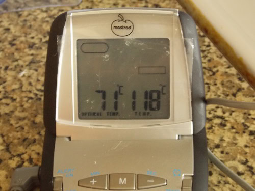 - Quand le thermomètre indique 116 C on retire la casserole du feu qui continuera a cuire.