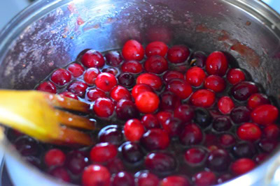 Placez la casserole sur feu moyen. Laissez chauffer doucement jusqu’à ce que le sucre fonde et commencez à se mêler au jus rendu par les canneberges.