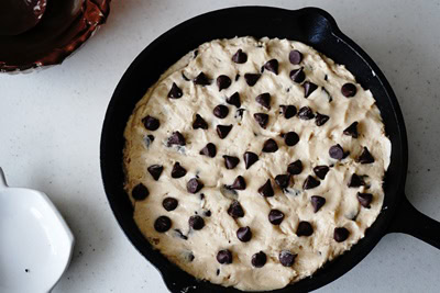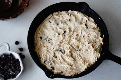 - Prendre la moitié de la pâte à cookie et l’étaler sur la poêle en fonte. Remonter légèrement les bords.