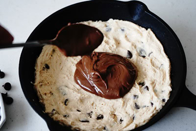 Un cookie géant croustillant et dorée de l’extérieur et au coeur coulant à la fameuse pâte à tartiner aux noisettes Nutella, cuit dans une poêle allant au four.