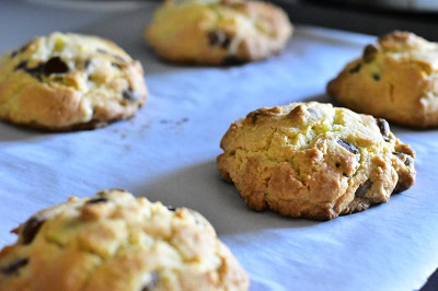 Placer au frais 30 minutes, préchauffer le four à 190 C et enfourner pour 15 à 20 minutes environ en surveillant la cuisson on doit obtenir une belle couleur dorée sans pour autant sur-cuire les cookies car ils continueront à cuire à la sortie du four.