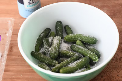 - Placer les concombre dans un saladier et couvrir de gros sel (environ 250 gr) et laisser macérer toute une nuit.
