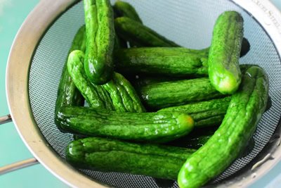 Rincez les concombres et placez-les dans un saladier et couvrir de gros sel (environ 250 gr). Laisser macérer toute une nuit.