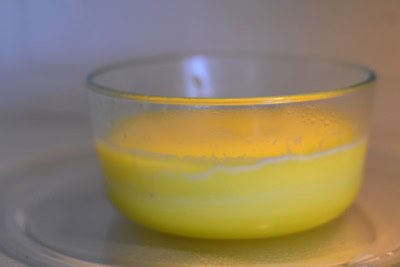 On place le saladier au micron-onde durant 1 minute à puissance maximale et ce pendant 5 minutes en prenant soin de retirer le saladier à chaque minute afin de bien mélanger la préparation biensure tout dépendra de la puissance de chaque micro-onde.