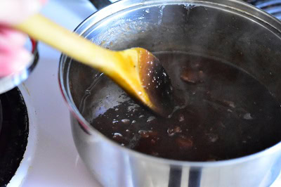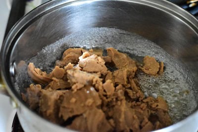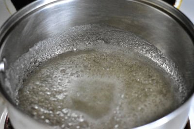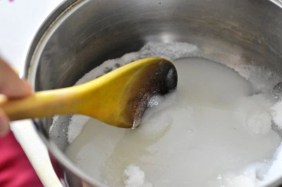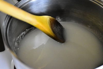 - Placer sur feu moyen jusqu’à ce que le sucre se dissout complètement et faire cuire à feu vif jusqu’à ébullition et que de grosses bulles se forment sur la surface du sirop.