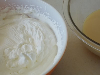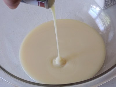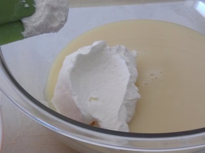 - Incorporer délicatement une grosse cuillère de la crème liquide dans le lait concentre sucre afin de détendre le lait.