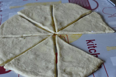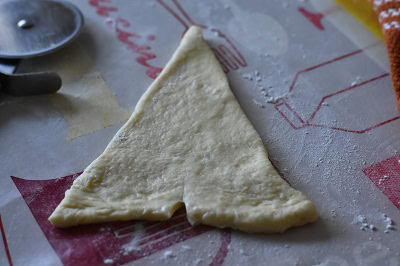 - A l'aide d'une roulette a pizza faire des triangle et rouler chaque triangle en forme de croissant ou encore des rectangles pour des pains au chocolat.