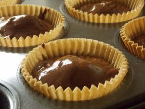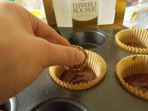 Remplissez les caissettes au 2/3 (commencez par verser environ 1 c-a-soupe de préparation, déposez un chocolat Ferrero Rocher et finissez par le reste de préparation).