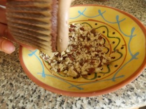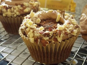 - Garnir les cupcakes en commençant par l’extérieur en cercle. Rouler délicatement ce glaçage dans des noisettes concassées.